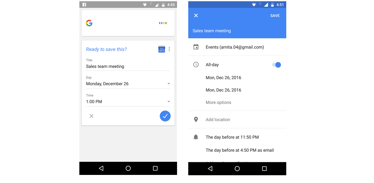 Just as the last point suggests to convey to users what all is possibly understood by the VA, it is just as crucial to convey what is not possible. For instance, if you use Google assistant to set up an event saying "Create an event called Sales team meeting for Monday 1 o'clock" it creates an event card (below left) and asks "Would you like to save this event?"